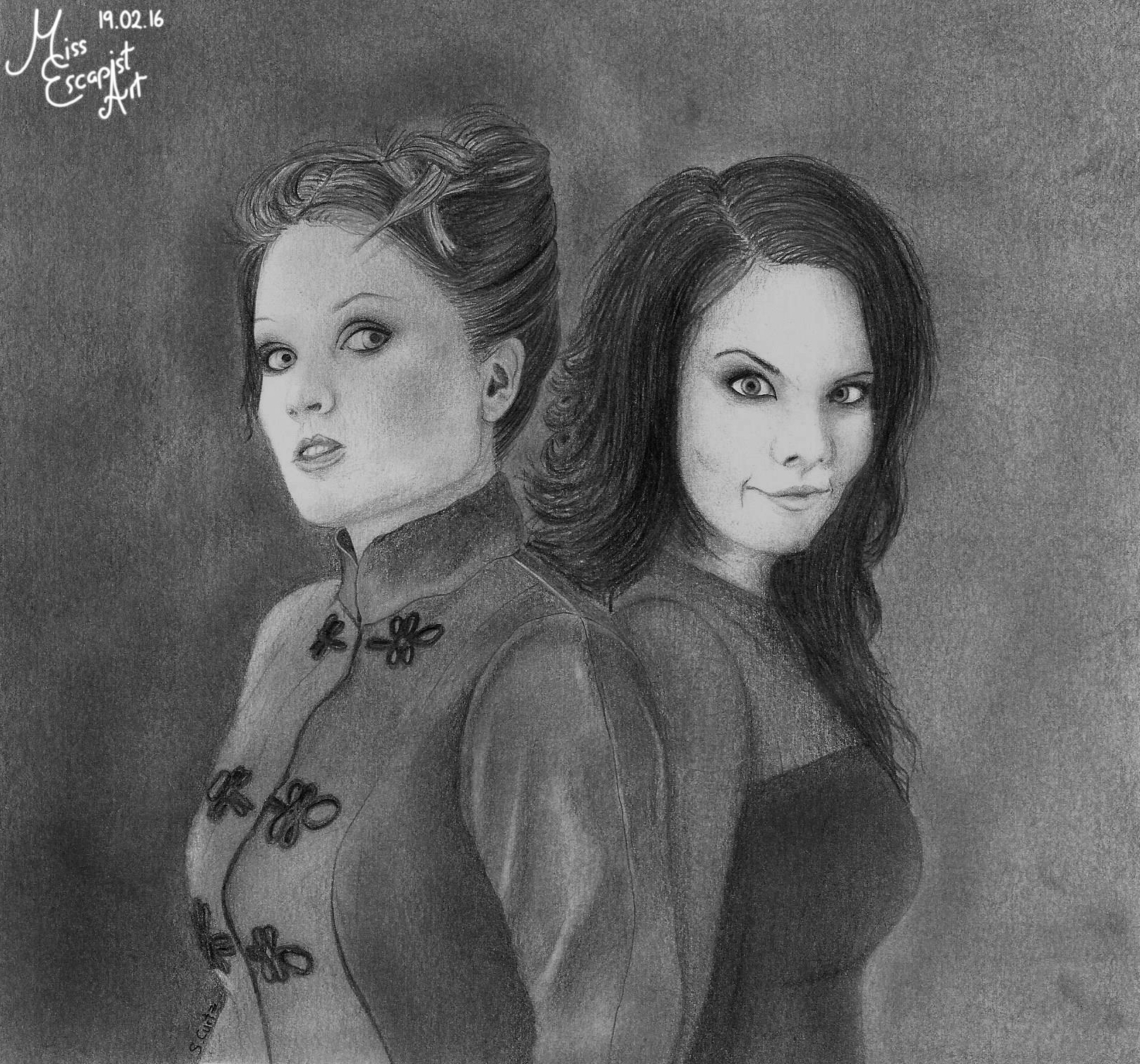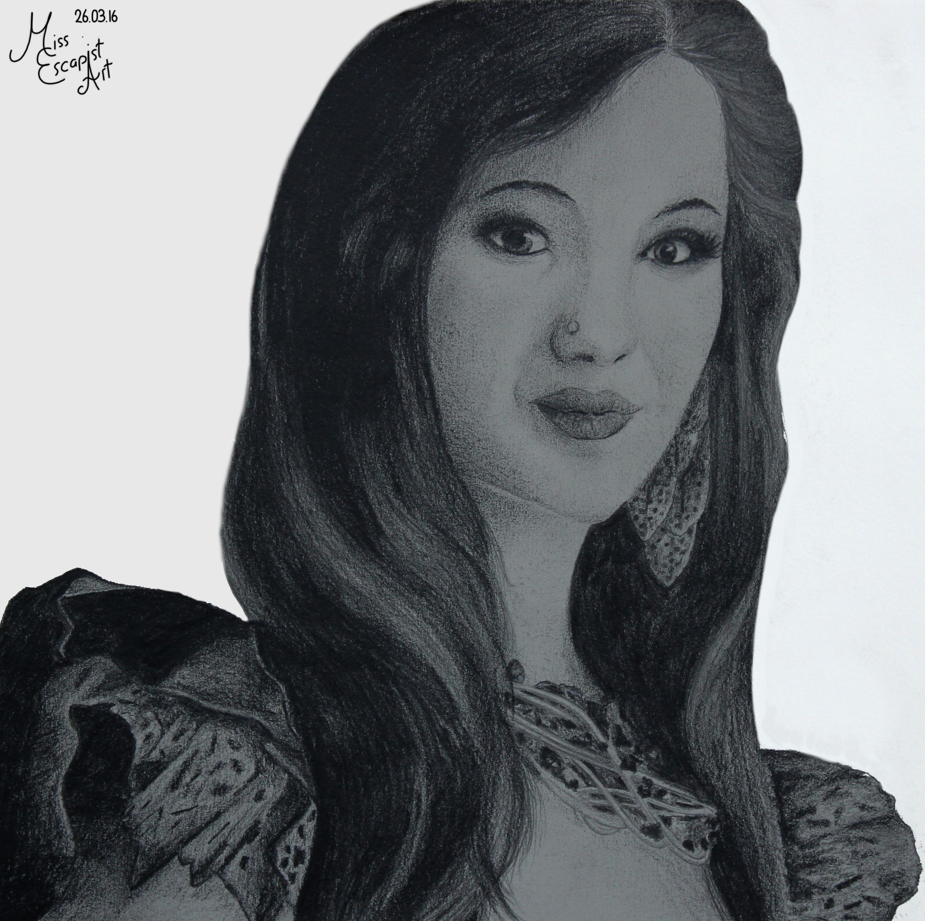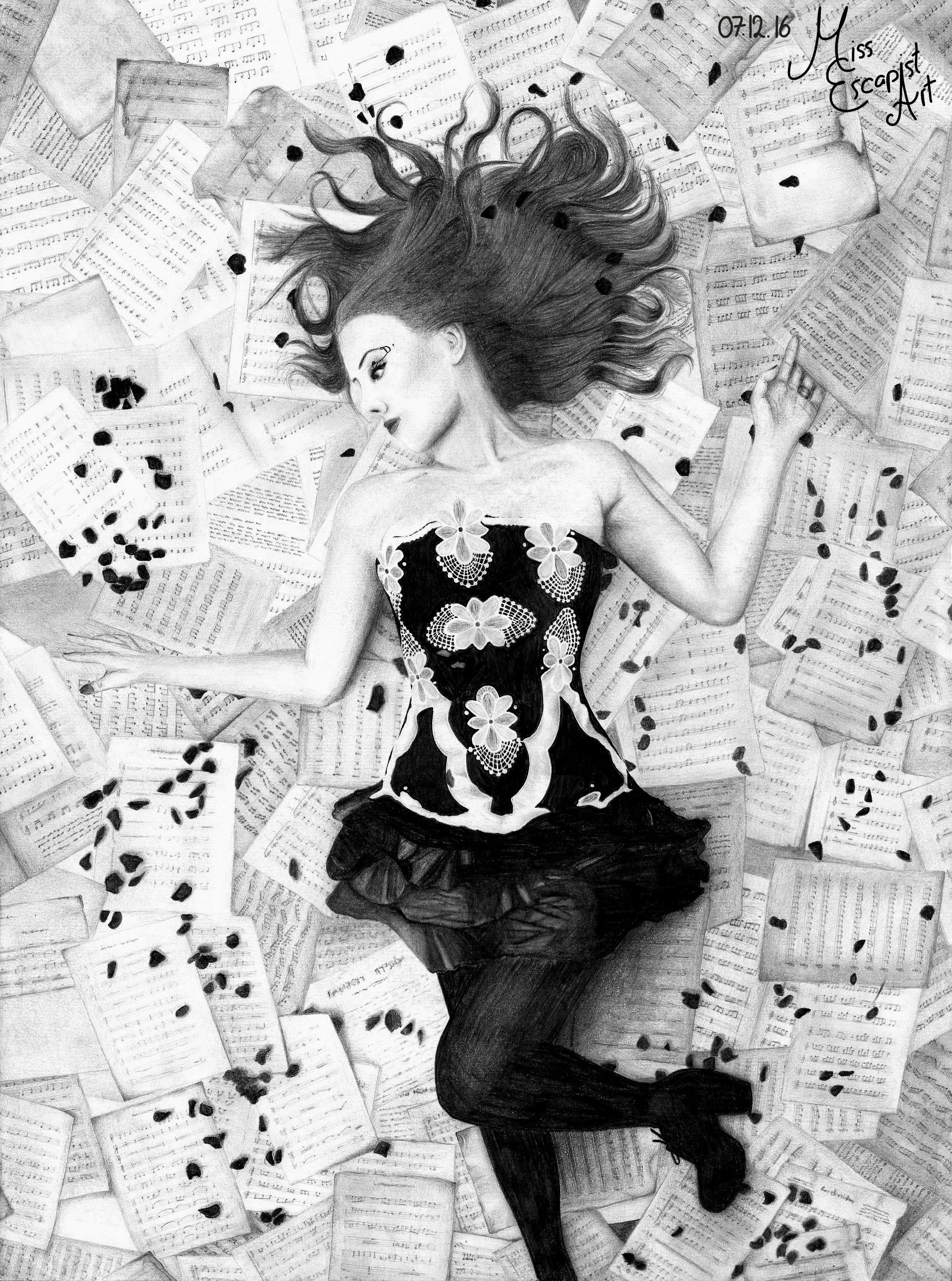 I couldn’t have chosen a more complicated reference photo for this drawing. I definitely couldn’t have. But I’ve fallen in love with the photo when I saw it for the first time and haven’t been able to get it out of my head ever since. It’s truly a piece of art. So one sunny afternoon in spring I got out my pencils and an A3 sheet of paper and started doing a rough sketch of Simone. The first thing I drew was the corset which already took me a lot of patience, as I had to draw white details on a black background. So I left out everything that had to stay white and shaded the rest. After that I went on with detailing and shading the parts that I had left white before. The legs and the shoe were quite simple to draw and quickly done. I continued with the arms, the face and then the hair. “Great!”, I thought. “Only the background left.”. Only…the background turned out be an absolute suicide mission that drove me totally crazy. I tried to draw every single sheet a true to the original as possible, from positioning to shading to the notes written on them. In fact, I tried to copy every single note 1:1. It took me ages and I almost lost my sanity over it. When I finally finished the drawing, it was already December. I had started in spring. Wow. That one required a lot of patience…